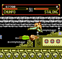 outfit), Moon (purple pants Chunfo), Rober (purple gi Pasta with brown boots), Ranboo (Stalong with purple pants) and Conbon (Musashi with purple outfit, final boss). The AI is much better then Street Fighter II's. This game uses Ryu's and Guile's sprites from Yoko's SFII for Cliff and Stalong. This game would later be hacked into The Legend which appeared on a 15-in-1 cart. The video of the cart can be viewed here:1994